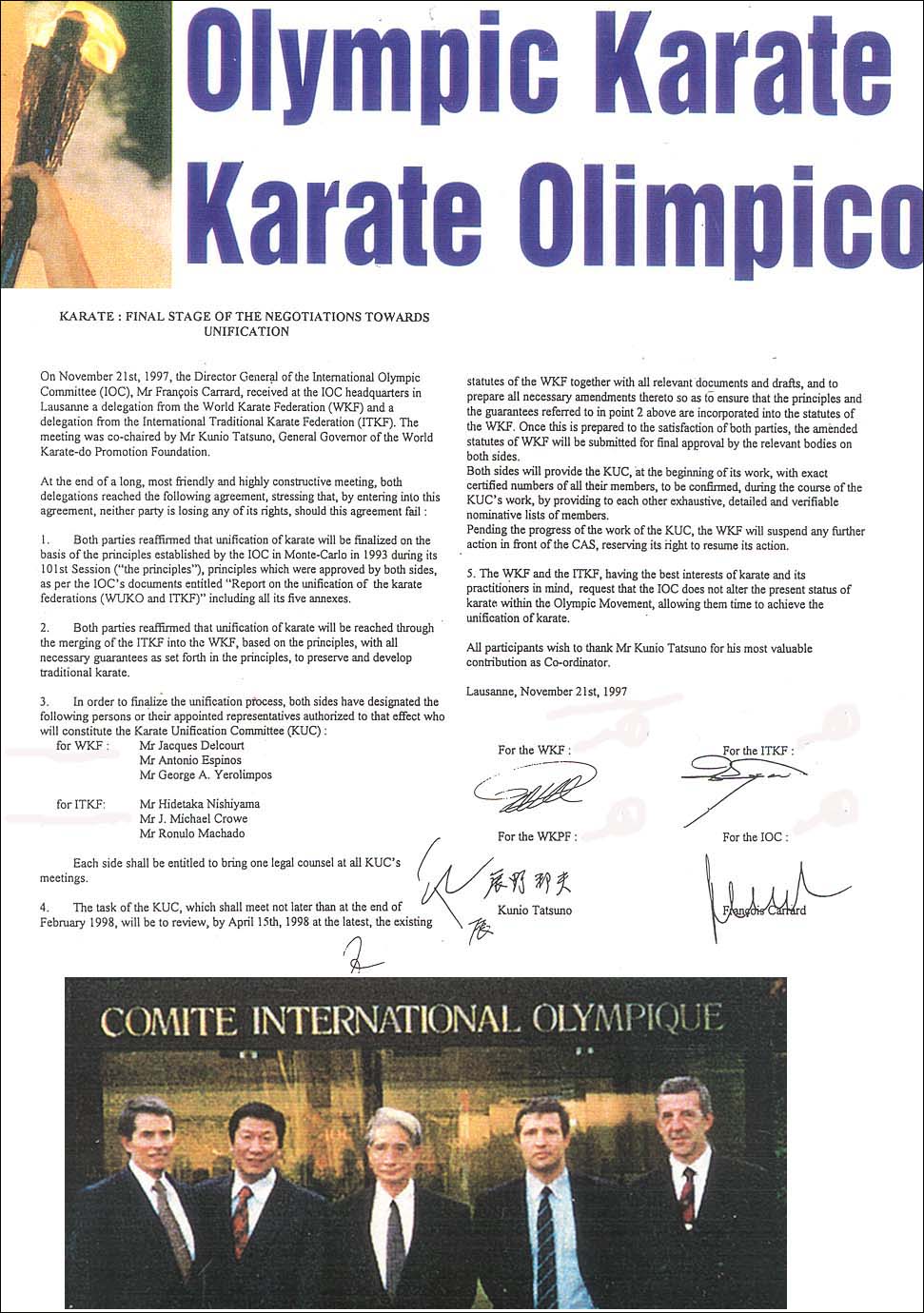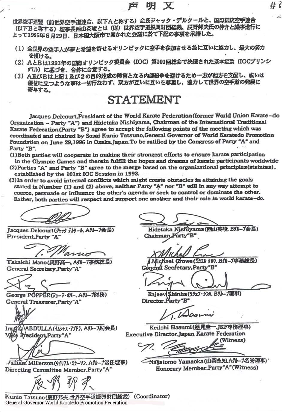 On June 29, 1996, in Osaka, Japan, WKF/ex-WUKO and the ITKF agreed to form one unified body ("Osaka Statement"). (See Exhibit #7-A)