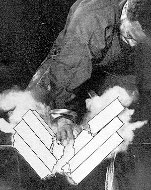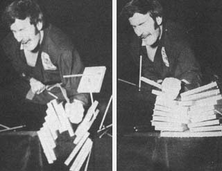 Ένα παράκεντρο χτύπημα (δεξιά) απέτυχε να σπάσει την κάτω σανίδα σε μια στοίβα των δέκα. Το κύμα θραύσης ταξίδεψε προς το κέντρο, όπου οι σανίδες είναι πιο εύθραυστες. Πολλή ενέργεια χάθηκε σ’ αυτή την οριζόντια κίνηση, έτσι ώστε δεν έμεινε αρκετή για να σπάσει η κάτω σανίδα.