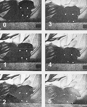 Tέσσερα ενδεικτικά σημάδια τοποθετήθηκαν στην πλευρά της γροθιάς έτσι ώστε η μετατόπιση, ταχύτητα και επιτάχυνση διαφόρων τμημάτων της γροθιάς κατά την διάρκεια της σύγκρουσης μπορούν νά οριστούν απ' αυτές τις φωτογραφίες, που πάρθηκαν με διαφορά ενός χιλιοστοδευτερόλεπτου. Αν και η γροθιά κάνει επαφή με την πλάκα στο 0 (αρχή μέτρησης του χρόνου), το ράγισμα δεν αναπτύσσεται πριν το 4ο χιλιοστοδευτερόλεπτα. Η γροθιά και η πλάκα είναι σε επαφή για 5 χιλιοστοδευτερόλεπτα. Καθώς η γροθιά χτυπάει την πλάκα επιβραδύνεται ταχύτατα. Η αλλαγή στις τοποθετήσεις των σημείων στις σχετικές μεταξύ τους θέσεις δείχνει ότι η γροθιά συμπιέζεται και παραμορφώνεται σε τέτοιο σημείο που σχεδόν δεν δρα σαν ένα στερεό σώμα. Άρα τα μοντέλα για την διαδικασία κρούσης δεν μπορούν νά θεωρήσουν τη γροθιά σαν στερεή.