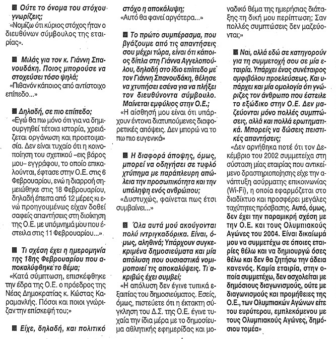 β) Για τις «επιχειρηματικές δραστηριότητές του», που προκάλεσαν παγκόσμιο σκάνδαλο, εκμεταλλευόμενος τη θέση του στην «Αθήνα 2004 –ΑΕ», ομιλεί και η Εφημερίδα «Άποψη» της 21.02.2004, στην οποία παραχώρησε συνέντευξη ομολογώντας ουσιαστικά τις έκνομες δραστηριότητές του.