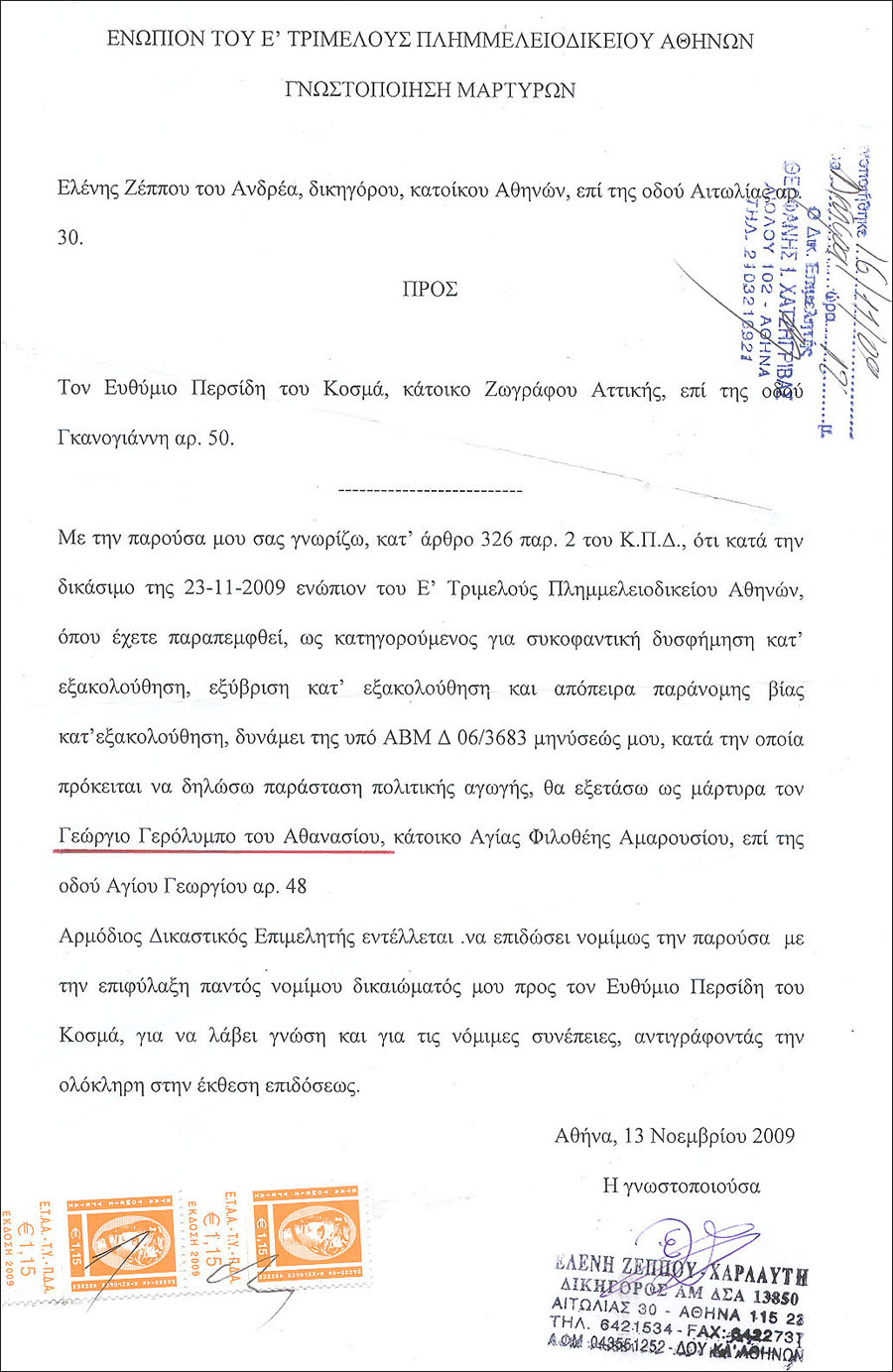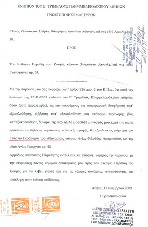 ΕΚΘΕΣΗ ΠΡΑΚΤΙΚΩΝ ........................... Από το από 15-7-2009 αποδεικτικό επιδόσεως της επιμελήτριας Δικαστηρίων Δημητροπούλου Βενετίας προκύπτει ότι ο κατηγορούμενος κλητεύθηκε νομοτύπως και εμπροθέσμως ..... (θυμάστε: εκείνο που θάφτηκε στα συρτάρια του Δήμου Αθηναίων είναι "νομοτύπως και εμπροθέσμως"!). ...........................