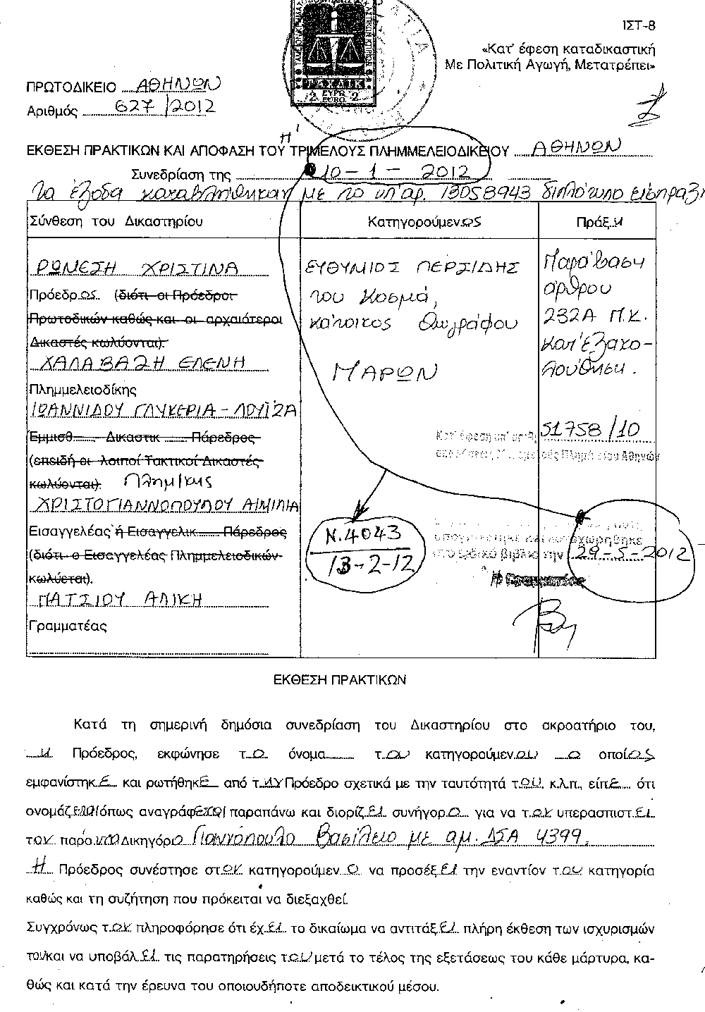 Το αποτέλεσμα στην εκδίκαση της ανωτέρω μήνυσης στο Εφετείο (20-7-12) ήταν να ΠΑΡΑΓΡΑΦΟΥΝ τα 2ο, 3ο και 4ο αδικήματα με ποινές κάτω των έξι μηνών και να μείνει μόνο το πρώτο της απλής δυσφήμησης, του οποίου η ποινή μετά την εκδίκαση στο Εφετείο από οκτώ μήνες έπεσε στους τέσσερις!