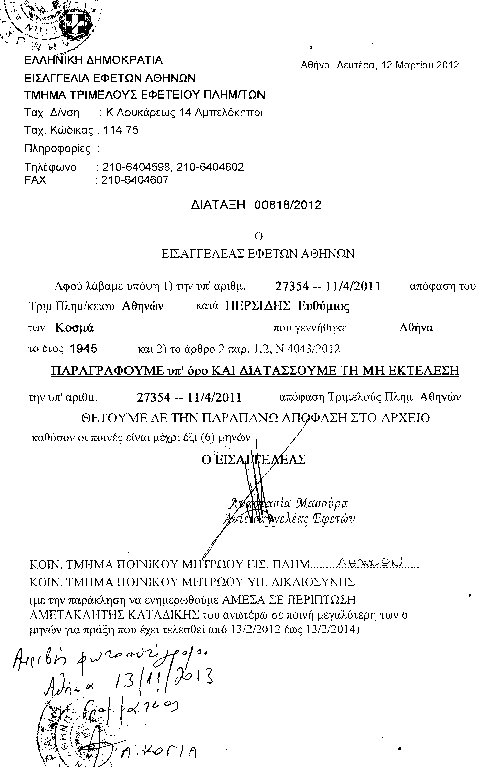 1) Στην πρώτη μήνυση του Γερόλυμπου είχα τιμωρηθεί με απόφαση Εφετείου με επτά μήνες φυλακή με τριετή αναστολή, εκ των οποίων έξι για συκοφαντική δυσφήμηση και ένα για εξύβριση. Εφόσον για κάθε αδίκημα η ποινή ήταν από 6 μήνες και κάτω, με βάση τον 4043/12 τα αδικήματα αυτά ΠΑΡΑΓΡΑΦΟΝΤΑΙ και οι ποινές ΔΕΝ εκτελούνται.