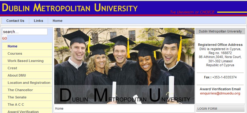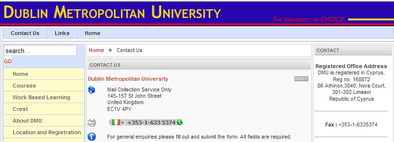 Στα άρθρα μου για τα οποία με μήνυσε ανέφερε και ότι ειρωνεύομαι το ... διδακτορικό του δίπλωμα!!! Θεός φυλάξει! Εγώ δεν είπα τίποτα για το διδακτορικό του από το Dublin Metropolitan University (DMU, Μητροπολιτικό Πανεπιστήμιο του Δουβλίνου). Το διδακτορικό είναι αυθεντικό, το έχει και ... βοήθειά του! Το πανεπιστήμιο είπα πως είναι ΜΑΪΜΟΥ, διότι παρ' όλο που είναι ... "Μητροπολιτικό του Δουβλίνου" και θα το περίμενε κανείς να το βρει στην Ιρλανδία, η διεύθυνσή του στο διαδίκτυο παραπέμπει σε ... σοκάκι στην Λεμεσό της Κύπρου και σε ... ταχυδρομική θυρίδα στο Λονδίνο (δείτε την ιστοσελίδα του κατωτέρω), από όπου συμπεραίνεται ότι το "ίδρυσε" κάποιος ... ψιλοαπατάκιας Κύπριος φοιτητής από τη Λεμεσό, που φοιτά στο Λονδίνο και πουλάει διπλώματα για ... χαρτζιλίκι! Το δε Φαξ από 353-κτλ., σήμερα με το ίντερνετ μπορεί κανείς να μένει στο ... Καματερό και να έχει φαξ με αριθμό ... Γουατεμάλας, (δηλαδή να είναι ... Γουατεμάλαξ!, αγγλιστί "What a Malax"!!!) και να παίρνει τα φαξ του στο email του!