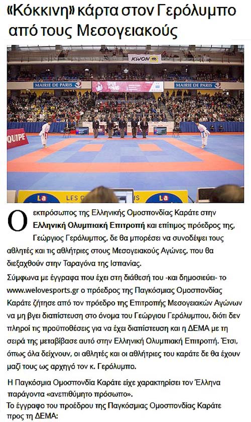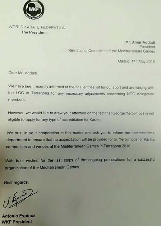 Σήμερα έχουμε 22-6-2018 και ο Πρόεδρος της Παγκόσμιας του καράτε Αντόνιο Εσπίνος έχει ήδη ζητήσει από την Επιτροπή Μεσογειακών Αγώνων, ως κατωτέρω, να μην εκδώσει κάρτα διαπίστευσης στον εκπρόσωπο της ΕΛΟΚ στην Ελληνική Ολυμπιακή Επιτροπή Γιώργο Γερόλυμπο, διότι έχει κηρυχθεί από την ολομέλεια της Παγκόσμιας του Καράτε ανεπιθύμητο πρόσωπο σε κάθε εκδήλωση του παγκόσμιου καράτε! (Βλέπε φωτό - με κλικ μεγαλώνουν!)