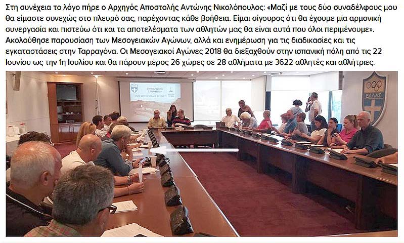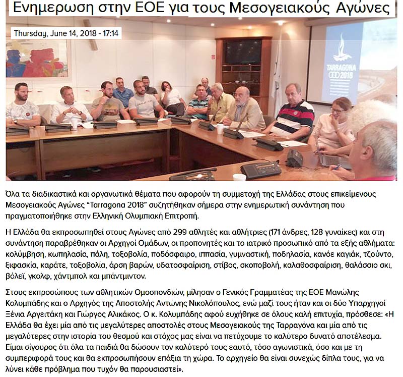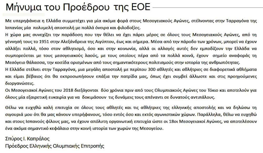 Όταν μάλιστα η Ελληνική Ολυμπιακή Επιτροπή κομπάζει ότι στέλνει μια από τις μεγαλύτερες ομάδες σε αυτούς τους Μεσογειακούς αποτελούμενη από 299 αθλητές και αθλήτριες (πού τα βρήκε τα λεφτά?)! Και όλα αυτά στην επίσημη ανακοίνωση του "νάρκισσου" προέδρου της ΕΟΕ, ο οποίος μπροστά στο να ποζάρει στο διαδίκτυο ξεχνάει να δημοσιεύει για τους υποτιθέμενους φιλάθλους (αν υπάρχουν τέτοιοι) τα αθλήματα που στέλνουν ομάδες στους Μεσογειακούς και τους αθλητές τους: