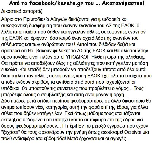 Δηλαδή, οι εγκαλούντες-μηνυτές από μια κατάθεσή μου 23 σελίδων πυκνογραμμένη στο μονό διάστημα με αντικείμενο λεπτομερέστατα αποδεικτικά στοιχεία, που αποδεικνύουν τις παρανομίες κατά την ίδρυση, τη λειτουργία, τις εξετάσεις και τα αποτελέσματα της Σχολής Προπονητών Καράτε 2014 υπό την αιγίδα της ΓΓΑ, μη βρίσκοντας τίποτα ψευδές και συκοφαντικό σε όλα όσα καταθέτω σχετικά, απελπισμένοι και μόνο για τη δημιουργία εντυπώσεων κατά την εκδίκαση της μηνυτήριας αναφοράς εναντίον τους με εγκαλούν-μηνύουν για συκοφαντική δυσφήμηση και ψευδή μαρτυρία από τις γενικόλογες αναφορές μου στον αρχιπαράνομο «μαγαζάτορα της ΕΛΟΚ» και στην πολυετή παράνομη λειτουργία της πολύπαθης αυτής ομοσπονδίας.