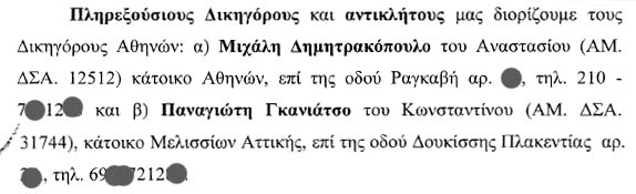 Στη σελίδα 36 της μήνυσης αναγράφονται οι πληρεξούσιοι δικηγόροι των μηνυτών, Δημητρακόπουλος και Γκανιάτσος: