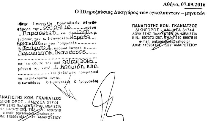 Στο τέλος της μήνυσης υπογράφει ο ένας από τους δύο πληρεξούσιους, ο Γκανιάτσος, αλλά ...