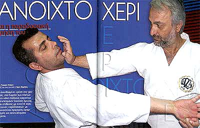 4) σε πάνω από 20 συλλόγους καράτε παριστάνει τον μεγάλο μάστερ (εκπαιδεύει εκπαιδευτές, δίνει σεμινάρια και μαύρες ζώνες και άλλα, βλέπε με κλικ αριστερά το διαφημιστικό του σε περιοδικό του καράτε) και μάλιστα παραδίδει μαθήματα προς κάθε καρατέκα και από περιοδικά του χώρου (βλέπε δεξιά την τεχνική του ... "Ανοιχτού Χεριού" σε φωτογραφία "σαλόνι" των δύο σελίδων του περιοδικού, Μάιος 2005). Αυτός είναι που δεν ασχολείται με το καράτε κυρία Δροσιά Μπάκου??? Είναι αυτός που του είπατε να καταθέσει ότι γράφω και εναντίον διευθυντή τράπεζας! Δεν το κατέβασε από το μυαλό του ούτε το διάβασε στο karate.gr, αφού δεν το διαβάζει, εσείς το γράφετε στα δικόγραφά σας για να αμαυρώσετε την προσωπικότητά μου και άρα εσείς του το είπατε να το καταθέσει!