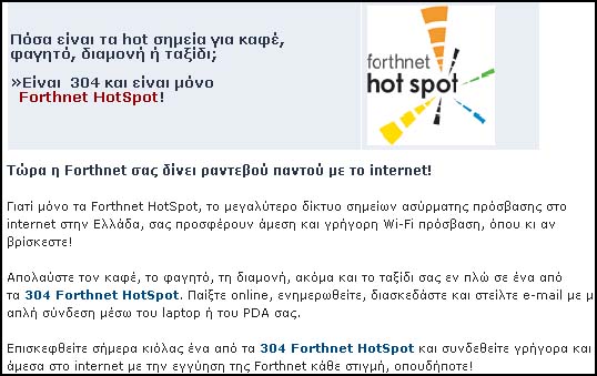 Forthnet Hotspots 6-6-2009: Η Forthnet έχει σήμερα 304 σημεία ελεύθερης πρόσβασης στο Διαδίκτυο.