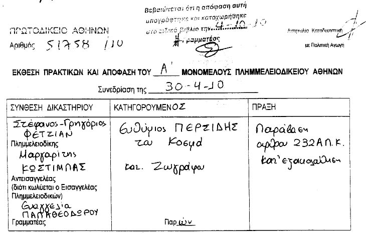 Σύνθεση του Α' Μονομελούς Πλημμελειοδικείου Αθηνών κατά τη συνεδρίασή του της 30-4-2010: