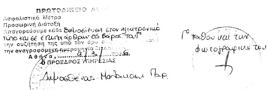 Απαγορεύουμε κάθε δημοσίευση στον ηλεκτρονικό τύπο και σε έντυπα άρθρων εις βάρος του καθού και την φωτογραφία του μέχρι την συζήτησή της υπό τον όρο συζήτησής της κατά την αναγραφομένη ημερομηνία δικασίμου.