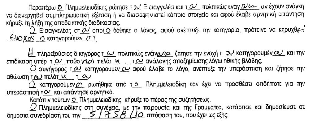 Κατά το διαδικαστικό της αποτύπωσης της ακροαματικής διαδικασίας είχαμε το επόμενο αποτέλεσμα στα πρακτικά χωρίς κανένα αιτιολογικό της απόφασης του Εισαγγελέα και χωρίς καμιά αναφορά στις αγορεύσεις των συνηγόρων :