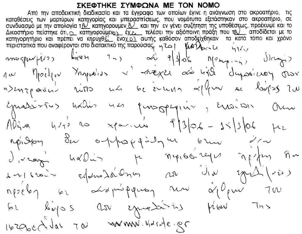 Η παρατήρηση αυτή είναι κραυγαλέα προφανής στην προκείμενη δίκη (αριστερά η αρχή της απόφασης), όπως θα δούμε παρακάτω, όσο και αν "έγινε προσπάθεια να κρυφτεί αυτό" κατά τη διατύπωση της απόφασης.