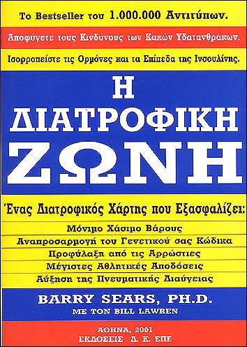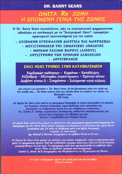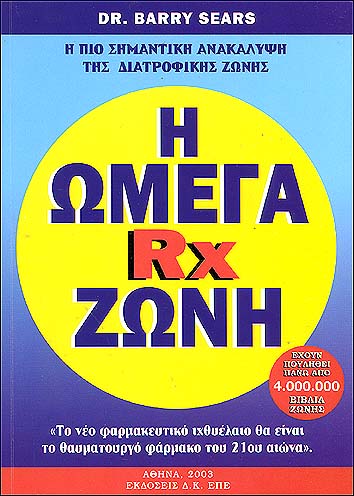 Στο οπισθόφυλλο του τρίτου βιβλίου (όπως δίνεται κάτω-κάτω!), όπως και στα εξώφυλλα και στα εσωτερικά όλων, σαφώς υποστηρίζεται η "θεραπεία σοβαρότατων ασθενειών δια της Διατροφικής Ζώνης και του ω-3 ιχθυέλαιου !!!