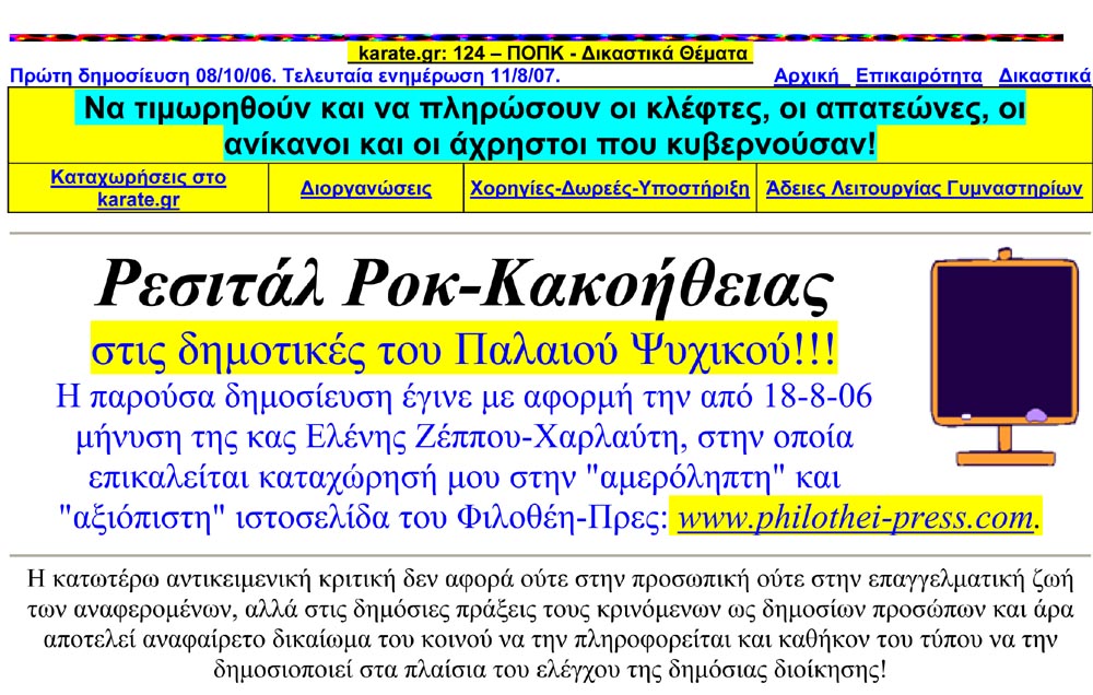 Η κριτική μου για τις πράξεις της κας Ελένης Ζέππου-Χαρλαύτη με άρθρα μου στο karate.gr άρχισε μετά τις παράνομες εκλογές στην ΠΟΠΚ τον Αύγουστο του 2005, όπου έβγαλε τον εαυτό της πρόεδρο, και έληξε στην ουσία για μένα με την δικαστική ακύρωση των εκλογών αυτών τον Αύγουστο του 2006. Από εκεί και πέρα όσο η ίδια συντηρεί τις αγωγές και τις μηνύσεις εναντίον μου αυτόματα η ίδια πάλι συντηρεί και την κριτική μου στις πράξεις της και τον δημόσιο βίο της.