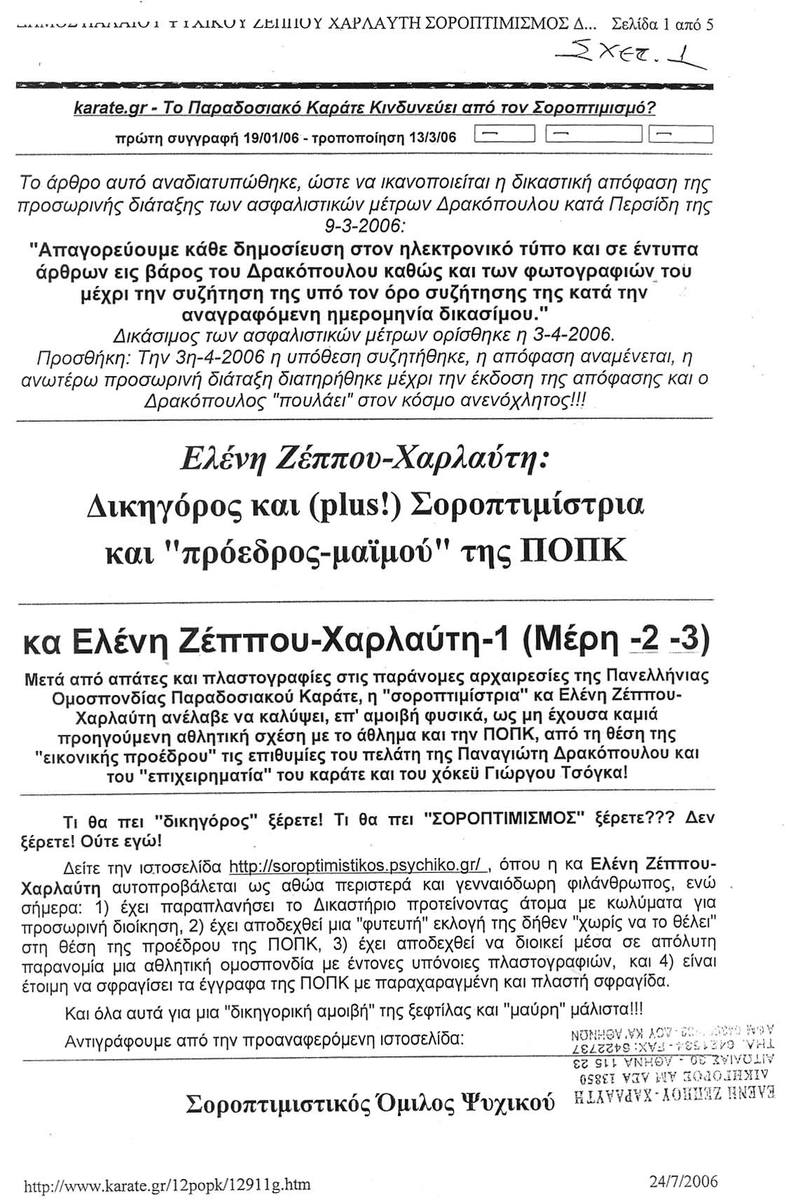Ταυτόχρονα με τις εξελίξεις στην ομοσπονδία η κα Χαρλαύτη, ως πληρεξούσια δικηγόρος του Π. Δρακόπουλου είχε υποβάλει αιτήσεις ασφαλιστικών μέτρων με καθυστέρηση 11 μηνών (3.8.2005) για καταχωρήσεις μου στην ιστοσελίδα μου (από Σεπτ. 2004) που αφορούσαν σε αντικαταστατικές πράξεις του κ. Δρακόπουλου και άρα παρακολουθούσε το www.karate.gr για τυχόν επόμενες καταχωρήσεις. Από αυτές τις αιτήσεις παραιτήθηκαν (Σχετ. 5).