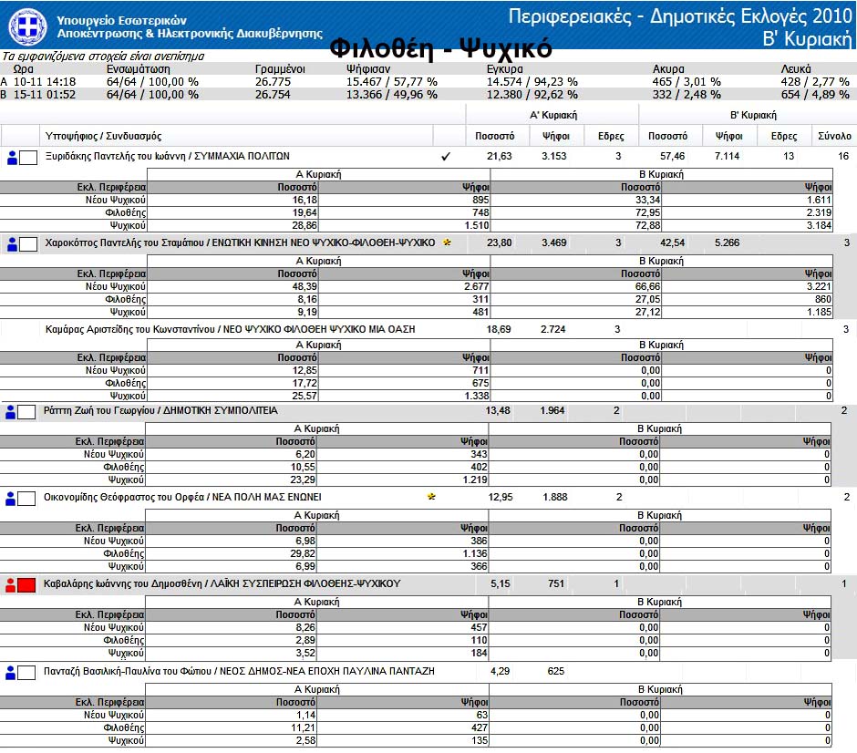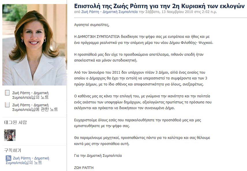 Πραγματικά, και για την κα Ζωή Ράπτη, υποψήφια δήμαρχο του δήμου Φιλοθέης-Ψυχικού, στο συνδυασμό της οποίας (ΔΗΜΟΤΙΚΗ ΣΥΜΠΟΛΙΤΕΙΑ) συμμετέχει σε κύρια εποπτικό έργο και η κα Ελένη Ζέππου-Χαρλαύτη, βρίσκουμε την 11/11/10 τον επόμενο πίνακα καταχωρήσεων: