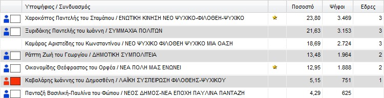 4) Στο Ψυχικό, η αναμέτρηση ήταν πιο άμεση. Την Α΄ Κυριακή οι Ξυριδάκης και Χαροκόπος είχαν επίσης πάρει τους φανατικούς οπαδούς και τους τυχαίους υποστηρικτές τους ο καθένας. Την Β΄ Κυριακή πήραν τους ίδιους φανατικούς οπαδούς και επί πλέον από περίπου 18% τυχαίους υποστηρικτές ο καθένας, αλλά ο Ξυριδάκης πήρε και 44-18=26% επί πλέον τους φανατικούς οπαδούς του δικού του προαστίου του Ψυχικού (δηλαδή τους τοπικιστές!)