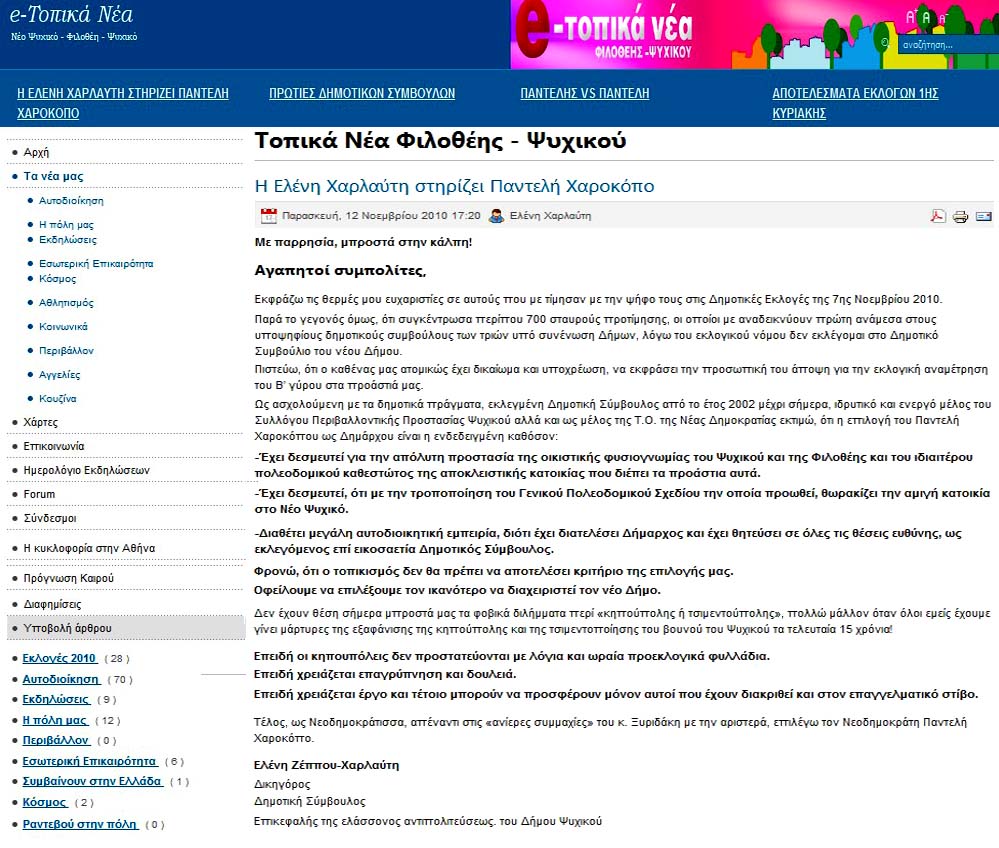 30/12/2010 - Βγήκαν τα τελικά αποτελέσματα από το Πρωτοδικείο Αθηνών και η κα Ελένη Ζέππου-Χαρλαύτη δεν εκλέγεται δημοτική σύμβουλος στο δήμο Φιλοθέης-Ψυχικού!