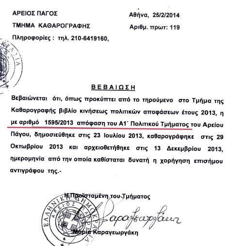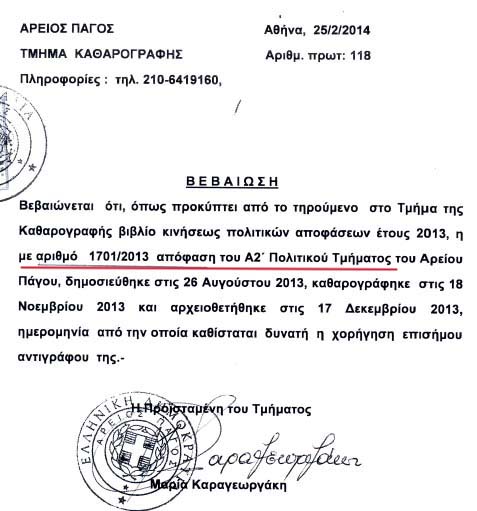 Για την πρώτη Υπόθεση (αστικό του Δρακόπουλου κατά Περσίδη) εκδόθηκε η επόμενη βεβαίωση του Αρείου Πάγου για τη δημοσίευσή της την 13/12/2013.