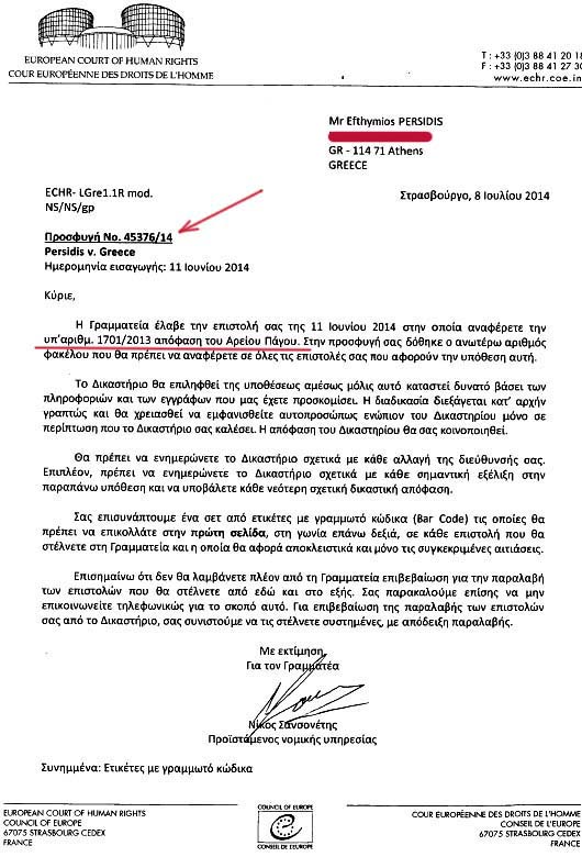 Σε ένα περίπου μήνα από την αποστολή των δύο Προσφυγών είχα και τις επόμενες δύο απαντήσεις ότι τις παρέλαβε η Ελληνική Γραμματεία στο ΕΔΔΑ!