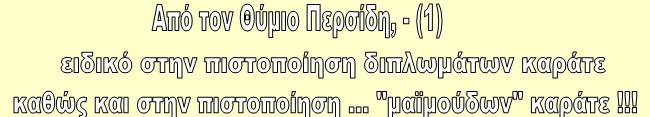 0 - Πρώτη παρατήρηση είναι ότι το στυλ του ελληνικού διπλώματος είναι ολόιδιο με το στυλ της βεβαίωσης της ITKF! Κάποιος "ευέξαπτος" ίσως έλεγε "ηλίθια αντιγραφή" ανόμοιων εγγράφων, και το πρώτο γενικό ερώτημα που γεννάται είναι: αφού τα δεξιά "διπλώματα" υποτίθεται ότι δίνονται στην Ελλάδα και από Ελληνική Ομοσπονδία, γιατί δεν είναι γραμμένα στα ελληνικά, αλλά είναι γραμμένα στα ... αγγλικά και στα γιαπωνέζικα? Στους τουρίστες τα δίνουμε?
