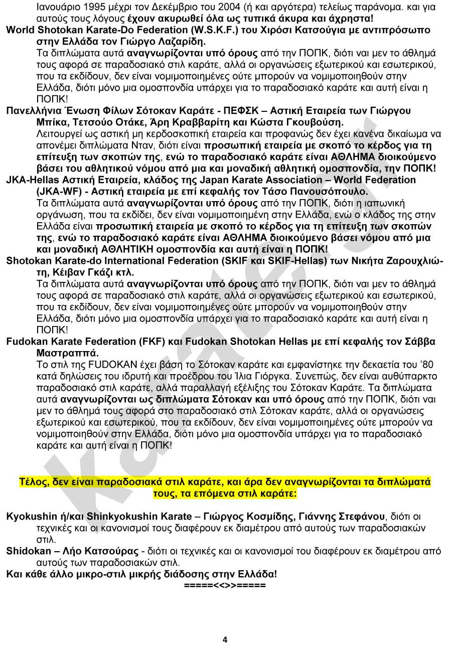 Από 30/1/1995 - Η ΠΟΠΚ είναι η αποκλειστικά αρμόδια και υπεύθυνη για τα παραδοσιακά στιλ καράτε στην Ελλάδα με τελεσίδικες και αμετάκλητες αποφάσεις Δικαστηρίων: 1996 - Απόφαση Πρωτοδικείου ΠΟΠΚ - ΕΛΟΚ! |