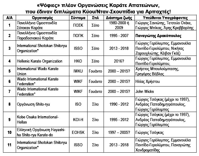 Είναι, επίσης, αυτονόητο ότι από τις οργανώσεις του ανωτέρω πίνακα, που λειτουργούν ακόμα σήμερα, κανένα σωματείο, καμιά αστική εταιρία, καμιά αλλοδαπή οργάνωση και κανένας ιδιώτης δεν είναι σε νομική θέση να κάνει εξετάσεις και να εκδίδει διπλώματα παραδοσιακού καράτε πανελλήνιας εμβέλειας και αποδοχής, διότι το αποκλειστικό αυτό δικαίωμα στον κυρίαρχο χώρο της Ελλάδας το έχει με τελεσίδικη και αμετάκλητη απόφαση δικαστηρίων (νομολογία) από τον Ιανουάριο του 1995 μόνον η Πανελλήνια Ομοσπονδία Παραδοσιακού Καράτε (ΠΟΠΚ).