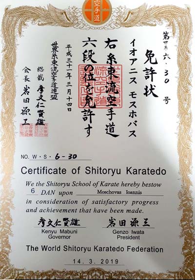 Με την αστική μη κερδοσκοπική εταιρία "Hellenic Karate-do Shitokai" (311-3, στη διεύθυνση https://hellenic-shitokai.gr/ ) ή ό,τι άλλο του ... Φαραώ Γιάννη Μοσχόβα προφανώς και δεν έχει κανένα δικαίωμα να απονέμει διπλώματα, διότι είναι προσωπική εταιρία με σκοπό το κέρδος για την επίτευξη των σκοπών της, ενώ το παραδοσιακό καράτε είναι ΑΘΛΗΜΑ υπαγόμενο στη ΓΓΑ και διοικούμενο βάσει του αθλητικού νόμου.