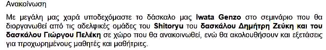 Ο Γιάννης Μοσχόβας φέρνει κάθε χρόνο τον Γκένζο Ιβάτα για σεμινάρια και εξετάσεις Νταν. Ανανεώνει δε ως πιστός "αντιπρόσωπος" το έγγραφο εκπροσώπησης της ομοσπονδίας του Ιβάτα κάθε τρία χρόνια καταβάλλοντας βέβαια τα απαραίτητα μετρητά!!!