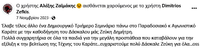 Συνεχίζει τις λαμογιές ο Δημήτρης Ζεύκης! "Δημιουργικό σεμινάριο" και διπλώματα μαϊμούδες από έναν αεριτζή, που δεν έχει ο ίδιος δίπλωμα προπονητή καράτε από τη ΓΓΑ, που έβαλε τον σύλλογό του στην ΕΛΟΚ πρόσφατα, αλλά ακόμα και για τον δικό του σύλλογο "ΖΕΥΚΕΙΟ ΑΘΛΗΤΙΚΟ ΣΥΛΛΟΓΟ" παρουσιάζει άλλον προπονητή! Παρ' όλα αυτά ο ίδιος γυρίζει σε άλλους συλλόγους και παριστάνει τον υπερ-δάσκαλο μοιράζοντας διπλώματα!!! Αυτά πρέπει να σταματήσουν!