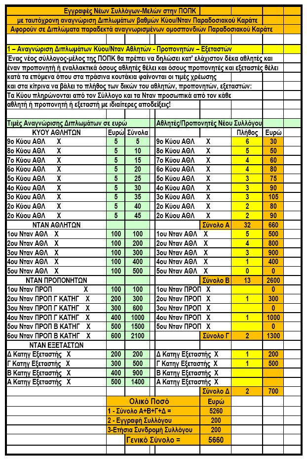 Στην επόμενη εικόνα βλέπετε τη συνολική χρέωση για να εγγραφεί ένας σύλλογος ως μέλος της ΠΟΠΚ με 32 αθλητές με αντίστοιχα Κύου, 13 αθλητές με αντίστοιχα Νταν, δύο προπονητές με 2ο και 4ο Νταν, και δύο εξεταστές Δ και Γ κατηγορίας.