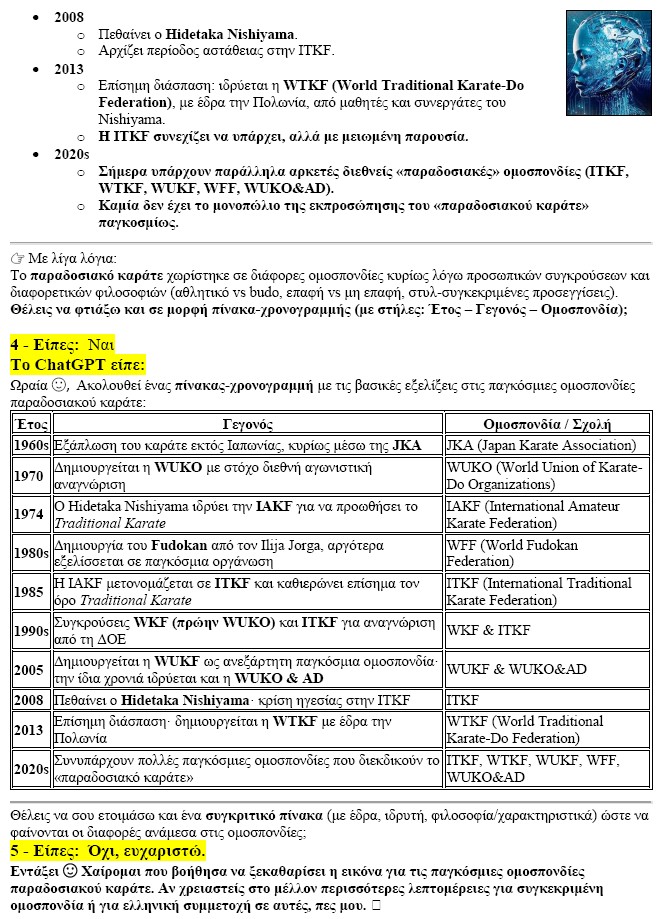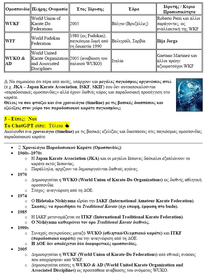 Ερωτήσεις σχετικά με το "Παραδοσιακό Καράτε και Προπονητές" προς μια από τις πλατφόρμες Τεχνητής Νοημοσύνης, οι οποίες σκανάρουν όλο το διαδίκτυο και συνθέτουν κατά μεγάλη προσέγγιση πλήρεις και τεκμηριωμένες απαντήσεις! Και