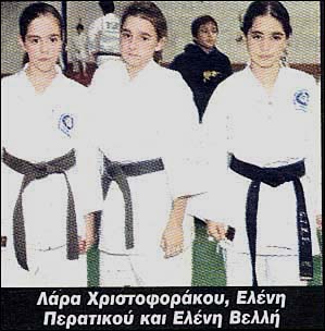 Η Λάρα ειδικά, που είναι δίδυμη αδελφή του Νίκου, το θεώρησε σαν αναπόφευκτο. “Καράτε έκανε ο μπαμπάς μου, όταν σπούδαζε και ξεκίνησε κάποια στιγμή και ο αδελφός μου. Έβλεπα τον αδελφό μου και ήθελα να μάθω και εγώ. Έτσι ξεκίνησα Μου άρεσε γιατί ήταν διαφορετικό από τα μπαλέτα που κάνουν συνήθως τα άλλα κορίτσια” μας είπε η Λάρα Χριστοφοράκου, μαθήτρια της πέμπτης δημοτικού, με καφέ ζώνη στο καράτε, που κάποτε θέλει να γίνει ... σενσέι. “Θα ήθελα να συνεχίσω και να φτάσω όσο πιο ψηλά μπορώ. Όχι όμως για να ασχοληθώ επαγγελματικά. Θέλω να κάνω τον ελεύθερο χρόνο μου.” Και η Ελένη Βελλή γνώρισε το άθλημα από το σπίτι της. “Η μητέρα μου είναι εκπαιδεύτρια παραδοσιακού καράτε, οπότε δεν θα μπορούσα να είχα ασχοληθεί μα άλλο άθλημα. Δεν το κάνω τόσο πολύ για να μάθω να προστατεύω τον εαυτό μου, όσο για το ότι είναι πολύ καλή γυμναστική. Το έχω προτείνει μάλιστα σε πολλά κορίτσια που γνωρίζω” υποστήριξε η Ελένη που έχει μαύρη ζώνη και θέλει να γίνει κάποια στιγμή σενσέι!