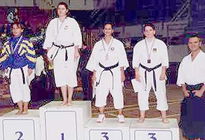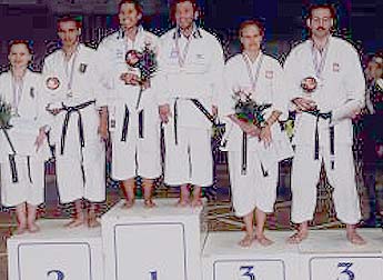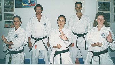 Photo: The members of the Greek delegation were:  Evagelia Lagoudaki (left), Caroline Tripou (middle),  Kiriaki Dimopoulou (right), Nikos Dimtsas (right), and the president of the GTKF technical committee sensei Panayiotis Drakopoulos, 6th dan.