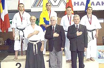 Φωτό: Απονομή στο Ομαδικό Κούμιτε Ανδρών. Μπροστά από τους αθλητές οι κ.κ. Νταν Στουπάρου (Ρουμανία), Χιντετάκα Νισιγιάμα (πρόεδος της ITKF) και Βέντσεσλαβ Νέντεβ (FYROM).
