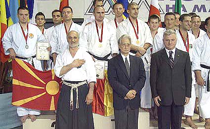 Photo: Handing-over of rewards  for the Men's Team Kumite: Rumania, FYROM, Italy, Poland. In front of the athletes the gentlemen Dan Stuparu (Romania), Nishiyama (ITKF's Chairman) and Venceslav Nedev (FYROM)