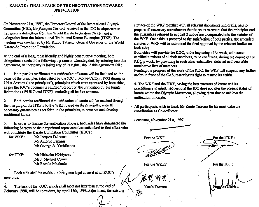Στις 21 Νοεμβρίου, 1997, ο γενικός Διευθυντής της Διεθνούς Ολυμπιακής Επιτροπή (ΔΟΕ), κ. Francois Carrard, δέχθηκε στην έδρα της ΔΟΕ στη Λοζάννη μια αντιπροσωπεία από την Παγκόσμια Ομοσπονδία Καράτε (WKF) και μια αντιπροσωπεία από την Παγκόσμια Ομοσπονδία Παραδοσιακού Καράτε (ITKF). Η συνεδρίαση προεδρεύθηκε από κοινού με τον κ. Kunio Tatsuno, Γενικό Κυβερνήτη του Παγκόσμιου Ιδρύματος για την Προώθηση του Καράτε..