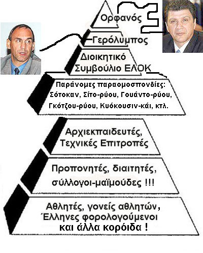 επεξηγήσεις: Η πυραμίδα της απάτης στο χώρο του καράτε της ΕΛΟΚ! 1- Στην κορυφή ο υφυπουργός Αθλητισμού Γιώργος Ορφανός, ο οποίος καλύπτει και υποστηρίζει τις παρανομίες του κολλητού του Γερόλυμπου με αντάλλαγμα να έχει πολιτικό έρεισμα στο επίπεδο των ομοσπονδιών, συλλόγων και απλών ψηφοφόρων. 2- Αποκάτω ο Γερόλυμπος (σαλτιμπάγκος των αθλητικών ομοσπονδιών ΕΛΟΚ, ΕΦΕΟΖ, ΕΟΠΕΚ, ΕΟΧ, ΕΟΚ, ΕΟΠΚ, ΕΟΣ, BKF, EKF, WKF και άλλων) ο οποίος με τις πλάτες του Ορφανού ελέγχει το ΔΣ και τους Τεχνικούς της ΕΛΟΚ και διαχειρίζεται ανέλεγκτα διοικητικά και οικονομικά το ανθρώπινο και το υλικό δυναμικό της. 3- Αποκάτω το ΔΣ της ΕΛΟΚ του οποίου ένα-ένα τα άτομα απολαμβάνουν των προσωπικών τους προνομίων σαν άτομα και σαν σύλλογοι-σχολές έναντι του αποκάτω επιπέδου των αρχιεκπαιδευτών και των τεχνικών, "πληρώνοντας" τον Γερόλυμπο με την ανοχή τους στις εξώφθαλμες οικονομικές και διοικητικές παρανομίες του.