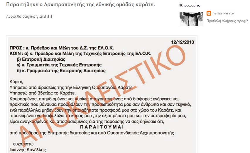 Τετάρτη, 27/11/2013, 6:15, δεν με πιάνει ύπνος και αναρωτιέμαι το γιατί! Είναι από την πολύ την ευτυχία, διότι ο Γερόλυμπος έχει τιμωρηθεί με έξι μήνες αποκλεισμό από την WKF για παράβαση άρθρου του καταστατικού περί δυσφήμησης της WKF, αφού με επιστολές στα μέλη της και δημοσιεύματά του στο διαδίκτυο έχει στραφεί εναντίον της και εναντίον του προέδρου της προκαλώντας ανυπολόγιστη ζημιά στο παγκόσμιο κύρος της WKF και συνεχίζει τα ίδια ακόμα και μετά την τιμωρία του. Η τιμωρία αυτή σημαίνει ότι εκπίπτει από όλες τις θέσεις του στις WKF/EKF, αλλά και στα μέλη αυτών τουτέστιν και στην ΕΛΟΚ, ήδη από την ημέρα εφαρμογής της ποινής του, δηλ. ήδη από εκείνη την ημέρα ΕΧΕΙ ΧΑΣΕΙ ΚΑΙ ΤΗ ΘΕΣΗ ΤΟΥ ΕΠΙΤΙΜΟΥ ΠΡΟΕΔΡΟΥ ΤΗΣ ΕΛΟΚ, ενώ απαγορεύεται να τον κάνετε ακόμα και ... παρέα στο καράτε!!! Χα, Χα, Χααααααααα!!!