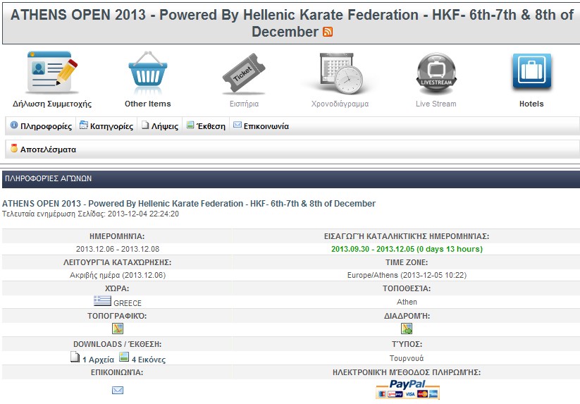 4-12-2013 - Στις 6-8/12/2013 διοργανώνεται OPEN διεθνές τουρνουά υπό την αιγίδα της ΕΛΟΚ με συμμετοχή 35 € για κάθε αθλητή σε κάθε αγώνισμα (κάτα ή κούμιτε)! Φυσικά οι φωτογραφικές μηχανές θα απαγορευτούν και οι Γερόλυμπος-Μπουλούμπασης θα μιλάνε κοντά-κοντά μόνο στις ... τουαλέτες και όχι στο στάδιο μήπως και τους πιάσουν σε φωτογραφία και την στείλουν στον Εσπίνος!!! (Θα την βρω, πού θα μου πάει!)
