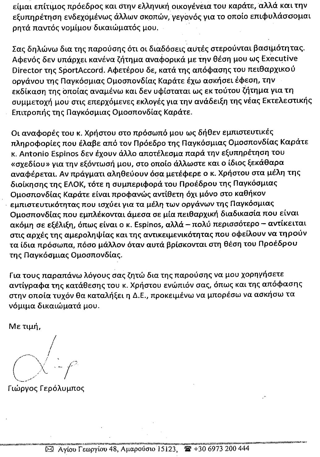 Συνεπώς, οι κατηγορίες είναι ψευδείς και οι δίκη στημένη από τον Γερόλυμπο, διότι αφορά μόνο και μόνο σε προσωπικά θέματα του Γερόλυμπου και όχι στα συμφέροντα της ΕΛΟΚ! Ήθελα να ξέρω το όνομα του Νομικού Συμβούλου, διότι φέρει ευθύνη για την σχετική νομική συμβουλή του να πάει η υπόθεση στην ΔΕ.