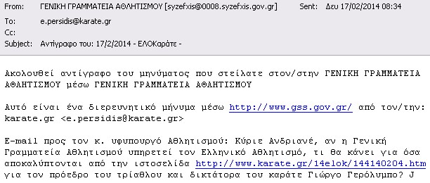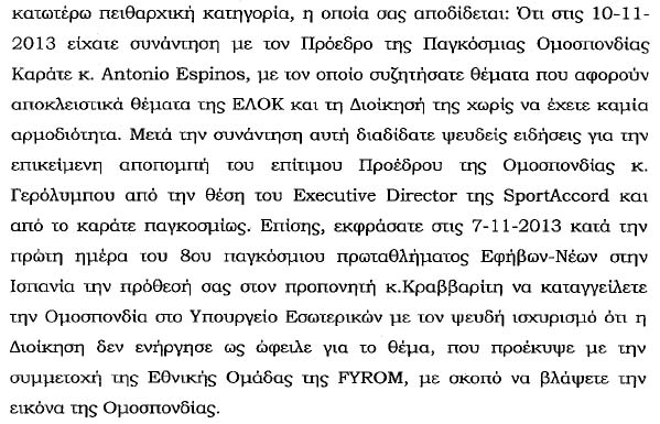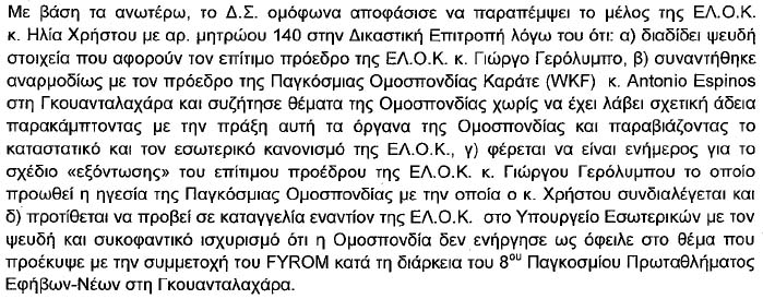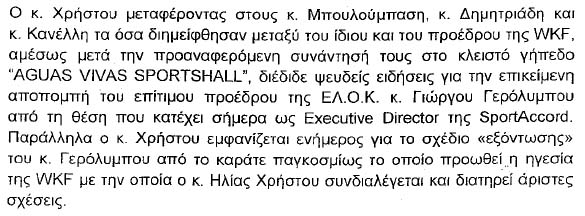 τους Μπουλούμπαση και Δημητριάδη προς τον Γερόλυμπο! Αυτό αποδεικνύεται από πολλά σημεία: 1) Σημαντικό στοιχείο για τα επόμενα είναι η ημερομηνία 2/8/2013 (ή κάποια προηγούμενη κοντά σε αυτήν) της κλοτσηδόν αποπομπής του Γιώργου Γερόλυμπου από την WKF και τιμωρίας του με αποκλεισμό από κάθε διοργάνωση της WKF (και κάθε μέλους της), όπως περιγράφεται και εδώ με κλικ! Αυτό σημαίνει ότι έπρεπε να έχει εκδιωχθεί και από την ελληνική ομοσπονδία που είναι μέλος της Παγκόσμιας! Την 14-11-2013, που γράφηκε η άνω επιστολή, τι "επίτιμος πρόεδρος" και κουραφέξαλα μας τσαμπουνάτε ότι ήταν! Ο άνθρωπος είναι ένα μηδενικό στο καράτε με απόφαση της Παγκόσμιας και το ξέρει όλος ο πλανήτης! 2) Από τις Διαπιστώσεις που "θα" αποτελέσουν το κατηγορητήριο απολύτως καμιά προφανώς ΔΕΝ αφορά την ΕΛΟΚ, αλλά είναι προσωπικά θέματα του Γερόλυμπου! Αν θίγεται, ας πάει στα δικαστήρια!