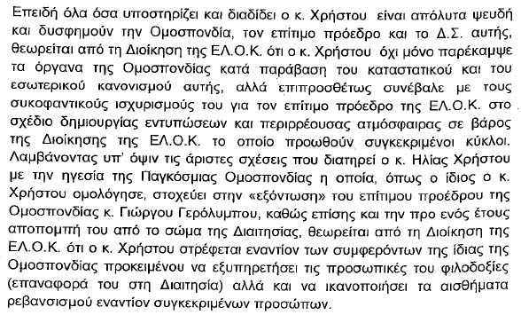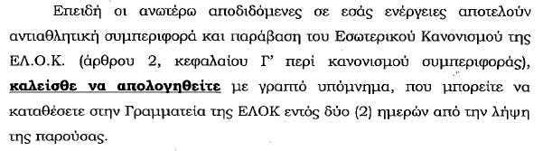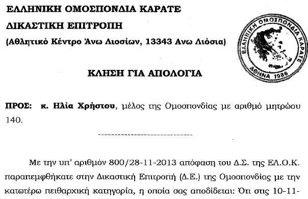 16/1/2014: Κλήση προς τον Ηλία Χρήστου για απολογία στη ΔΕ της ΕΛΟΚ. (και συνημμένα)
