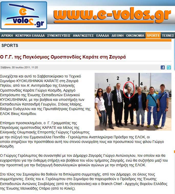 Από τα ανωτέρω προκύπτει ότι ο αντιπρόεδρος της ΕΛΟΚ Γιώργος Κοσμίδης διαφημίζεται ως "ενεργός δάσκαλος καράτε υπό την αιγίδα της ΕΛΟΚ", δίνοντας μάλιστα και διπλώματα Κυόκουσιν Καράτε!!! Πείθεται το ΣΔΟΕ ότι ο Κοσμίδης δουλεύει ΔΩΡΕΑΝ για τις ψυχές των παππούδων του??? Πώς να μην είναι πειθήνιο όργανο του Γερόλυμπου, όταν έχει εξασφαλισμένη την επαγγελματική λειτουργία της σχολής του. Όπως όλοι τους, είναι "μη αμειβόμενο μέλος" του ΔΣ της ΕΛΟΚ, αλλά αναντίρρητα εκμεταλλεύεται άκρως επαγγελματικά την ΕΛΟΚ κατά τον πλέον θρασύτατο τρόπο!!! Η τιμωρία του πρέπει να είναι παραδειγματική!