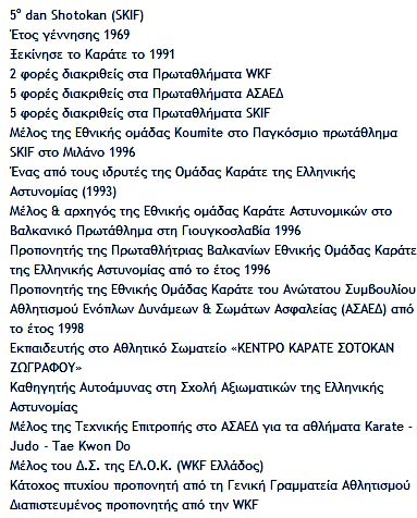 Ο Γιώργος Καρβούνης δημοσιεύει το αριστερά βιογραφικό του ... ενώ στον ιστότοπο του συλλόγου, που κάνει τις προπονήσεις καράτε, δημοσιεύει τα ακόλουθα: