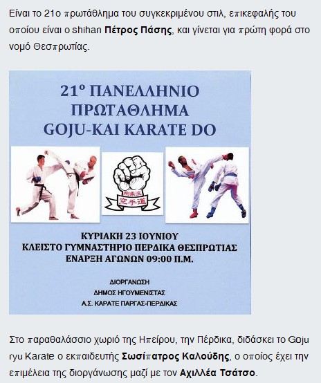 Ο shihan (δηλαδή ο πλέον υψηλόβαθμος εκπαιδευτής) Πέτρος Πάσης διαφημίζεται να διοργανώνει το 21ο Πανελλήνιο Πρωτάθλημα Goju-kai Karate-do, δηλαδή του στυλ στο οποίο φέρεται ως αρχηγός στην Ελλάδα, την Κυριακή, 23 Ιουνίου 2013.