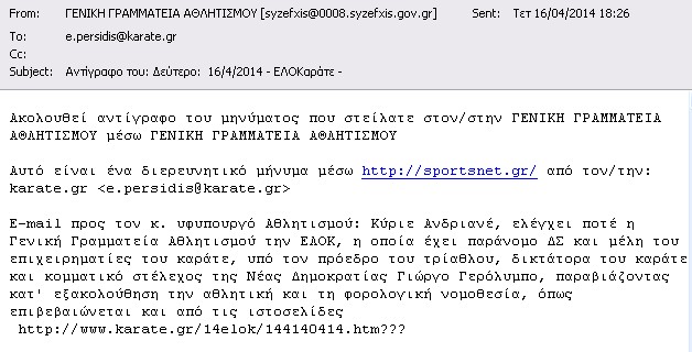 Αποδεικτικό αποστολής και λήψης email προς την Γενική Γραμματεία Αθλητισμού